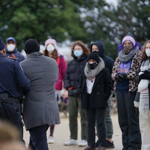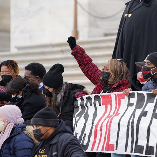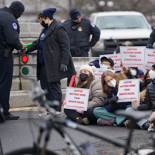 I did not make the decision to get arrested lightly. Engaging in civil disobedience is a solemn act, with deep roots throughout history in movements for equality and freedom. For civil disobedience to be effective, there should be good cause and it should fit into a larger strategy for the movement. There is no question that the cause — our cause — is worth putting our bodies on the line for. But what about strategy? It may seem strange that we decided to risk arrest after the vote was over. But as my dear friend Elizabeth Hira argued to me the night before, our responsibility in this particular moment was to bear public witness to the unjust actions of our representatives and to remind others — throughout the country — that a short term loss is not the end. Two Senators will not get to decide the fate of American democracy. We can mourn in the short term, if only to allow us the space to get back to work on Monday.