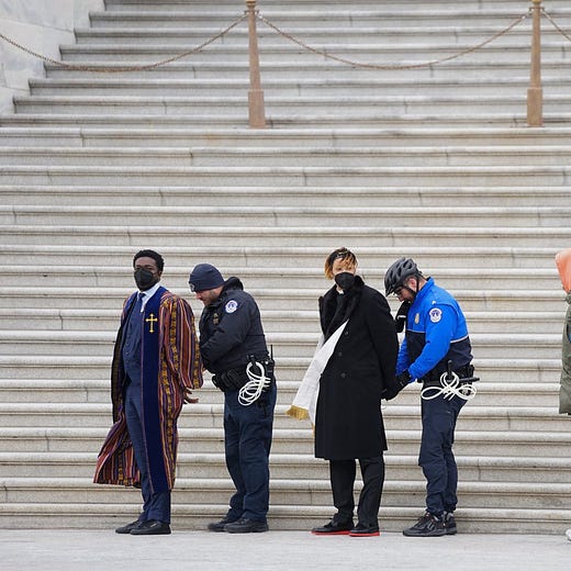 We held a rally a few blocks from the Capitol and when the speakers were finished we began quietly marching towards the Capitol building. The police had barricaded the entrance to the Capitol grounds, so we walked as close as we could and collectively sat down in the street. As the press began to gather, and as the police told us that we were in violation of the law, our group began to sing and chant. It was a joyous moment of defiance in the face of political dysfunction. The police slowly removed us from the ground, one by one, and we accepted the arrests without struggle. Soon, Representative Bowman arrived and crossed the police tape where we were being held. He was arrested, and we all expressed our profound gratitude to him for standing with us — and he expressed similar sentiments back to us.