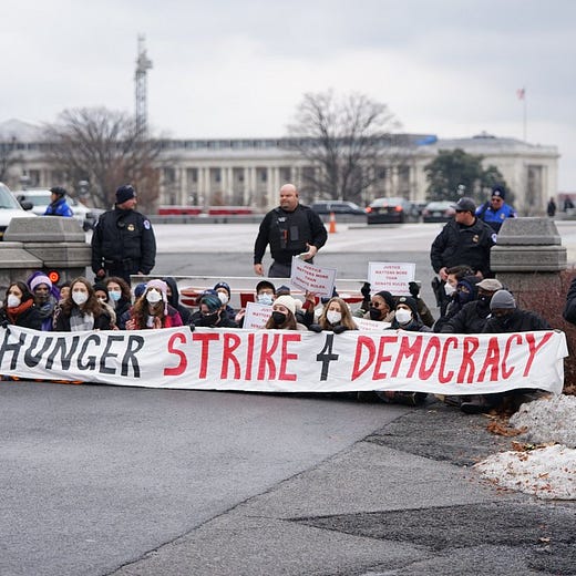 On Tuesday, they took their actions one step further. A group of the hunger strikers, in coordination with a coalition of faith leaders and democracy organizers, engaged in a sit-in on the Capitol building steps and were arrested. The hope was that this action — which included participants from Arizona and West Virginia — would put final pressure on Senators Manchin and Sinema to do whatever it took to pass the FTVJLA (i.e. reform the filibuster). While we know that ultimately nothing changed Sinema and Manchin’s minds, this effort on Tuesday did generate a ton of positive press coverage, including from The Washington Post (see here).